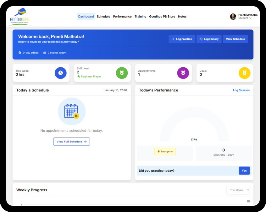 GoodHue PB Student web application provides players with a complete digital experience where they can set up their profiles, manage training schedules, track daily performance, and access training resources. Through this platform, users can monitor their progress, explore tournaments, and gain personalized insights through notes and questionnaires—all within a clean, modern, and easy-to-use interface.